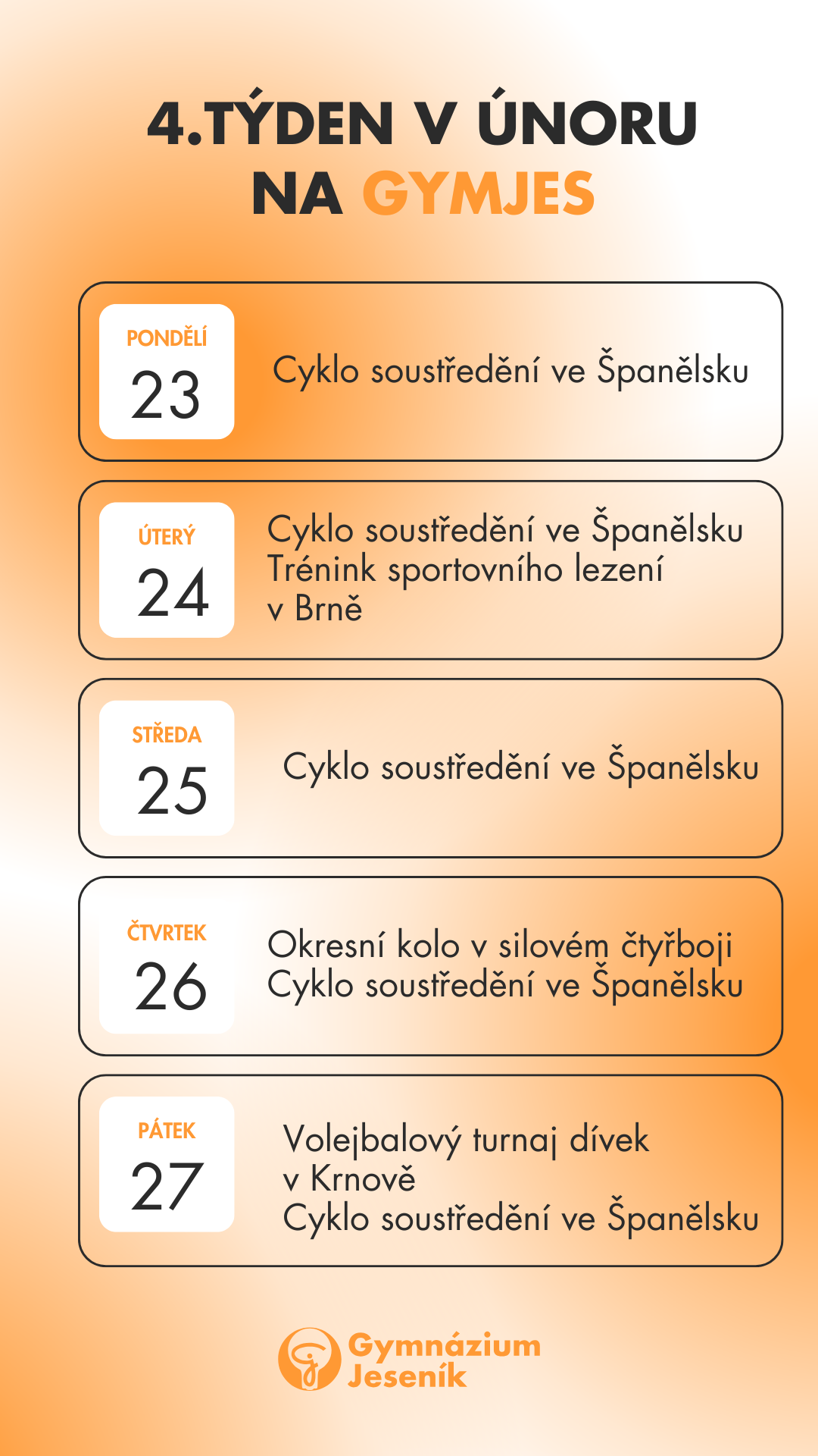 Každoročně vás zveme na sportovní akce jako je Vánoční laťka, NonStopBasketbal, StreetBasketbal. S našimi studenty jezdíme na vodácký výcvik, Kurzy GO, Adaptační kurzy, lyžařské kurzy.