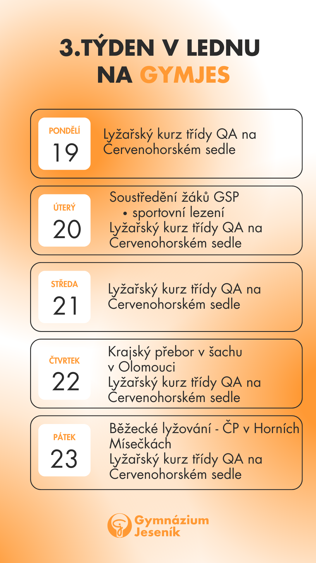 Každoročně vás zveme na sportovní akce jako je Vánoční laťka, NonStopBasketbal, StreetBasketbal. S našimi studenty jezdíme na vodácký výcvik, Kurzy GO, Adaptační kurzy, lyžařské kurzy.