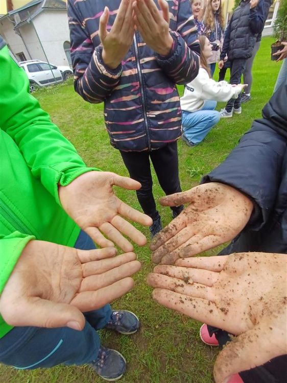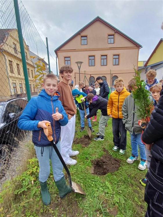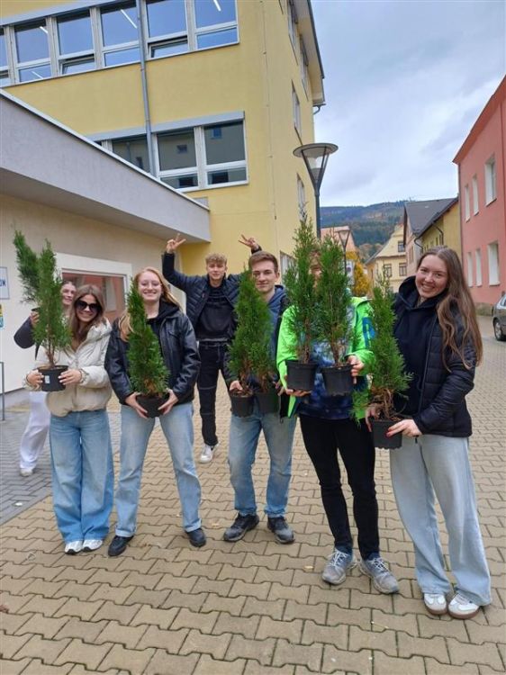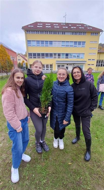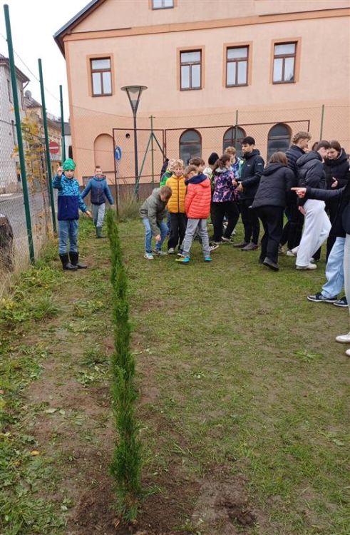 Další hodinu jsme společně sadili 10 tújí na pozemku školy. Každá trojice žáků z primy dostala stromek, který do jimi vykonané díry zasadili. Se vším pomáhali moji studenti z 3.ročníku.